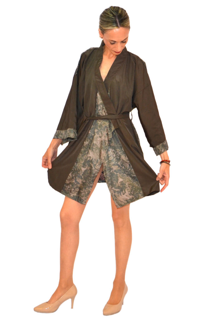 Su patrón ha sido creado a partir del estilo original de la prenda: mangas cuadradas y cuerpo rectangular que envuelven la silueta con un cinturón. Sin embargo, Debla de la Vega moderniza el concepto del kimono jugando con los largos y tejidos, así como el grosor de sus cinturones. Abierto, cerrado, con jeans o vestido, o usado como pieza única, la versatilidad de esta joya de la moda, que es tendencia absoluta, no tiene límites.