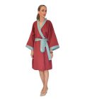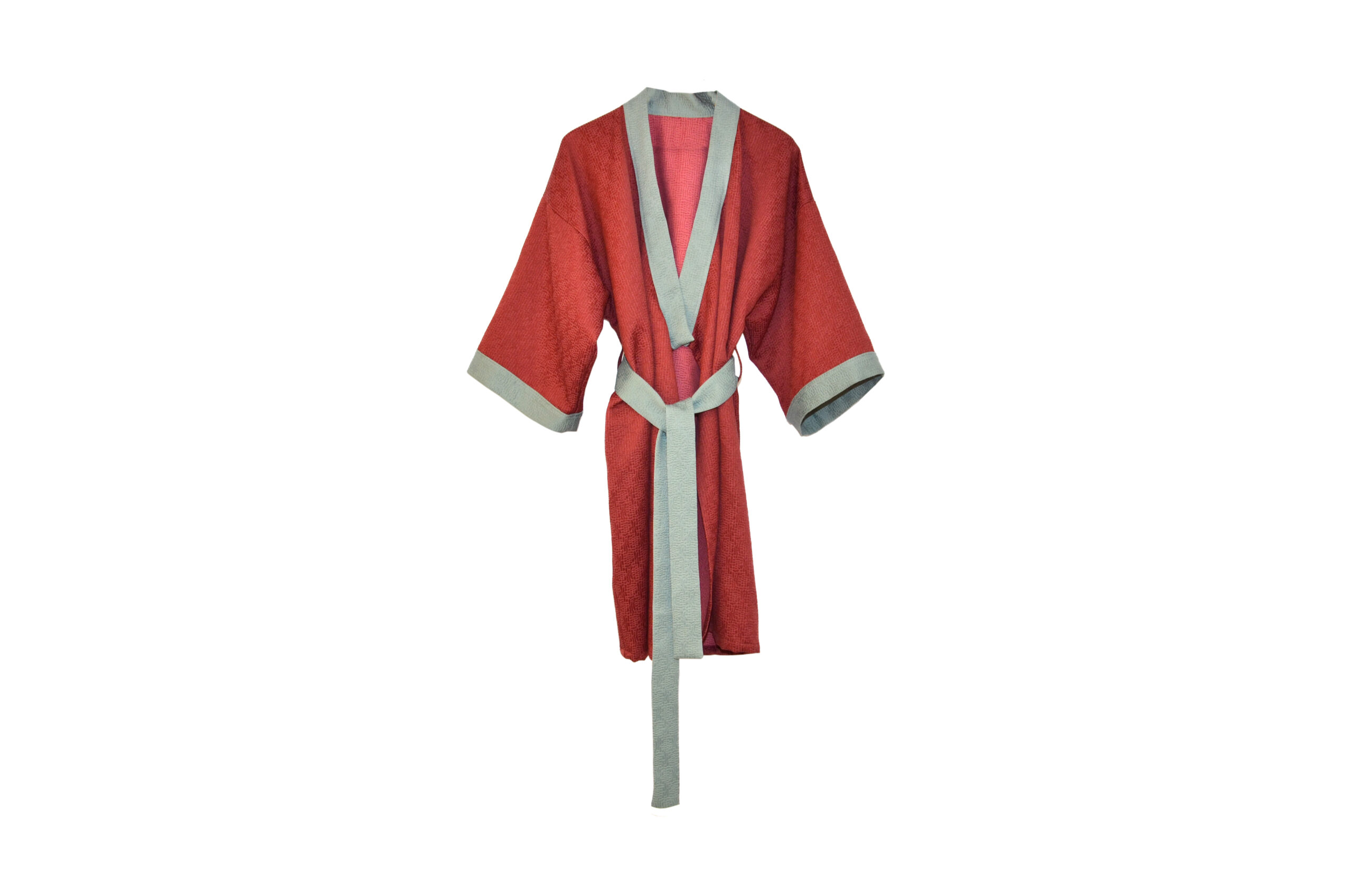 Poder y elegancia en estado puro. Una prenda esencial para cualquier amante de la moda. Su gruesa tela, pero ligera al mismo tiempo sobre el cuerpo, cuenta con un estampado en relieve combinando el verde aguamarina y granate. También está disponible a la inversa. Kimono confeccionado a mano. Se aconseja su lavado a mano, en frío.